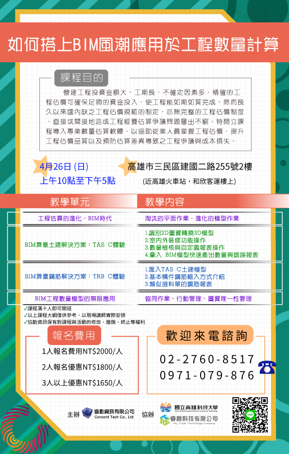 【4/26 高雄開課】 如何搭上BIM風潮應用於工程數量計算